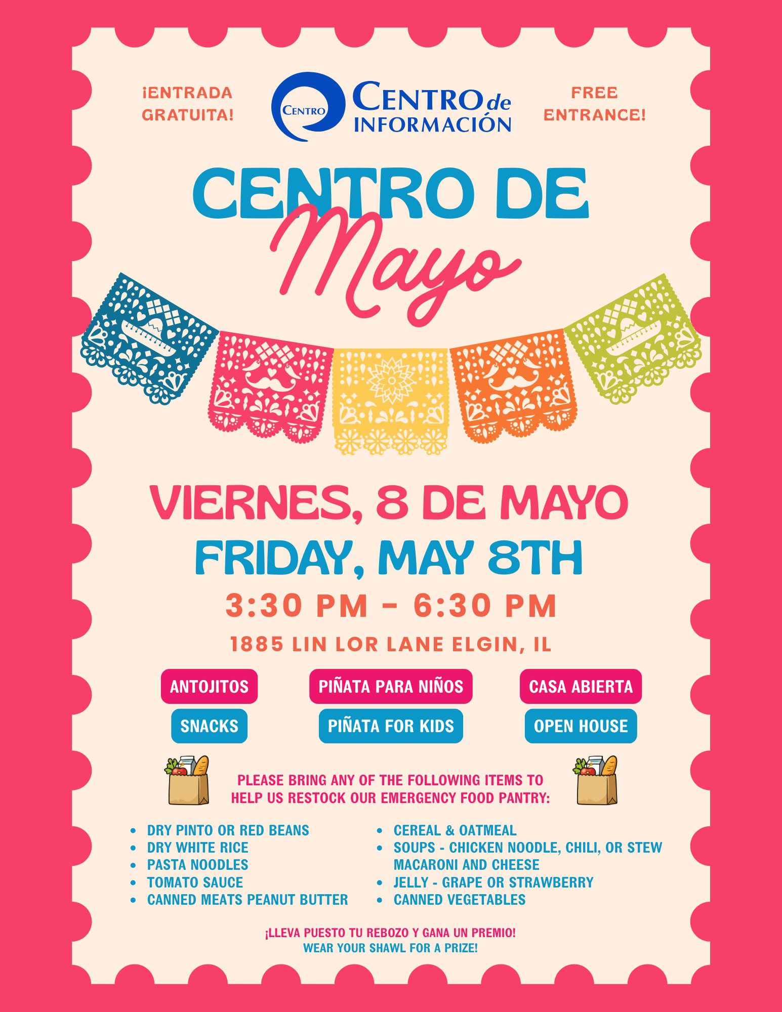 ¡TODOS ESTÁN INVITADOS a la jornada de puertas abiertas anual de Centro el 8 de mayo! ¡Anoten la fecha en sus calendarios e inviten a sus amigos, familiares, vecinos y compañeros de trabajo a unirse a nosotros en esta celebración anual! Los equipos de Centro ofrecerán breves presentaciones sobre nuestros servicios, entre música, aperitivos y mucha diversión. También aceptamos donaciones para el banco de alimentos (consulte el folleto para ver la lista de artículos recomendados).