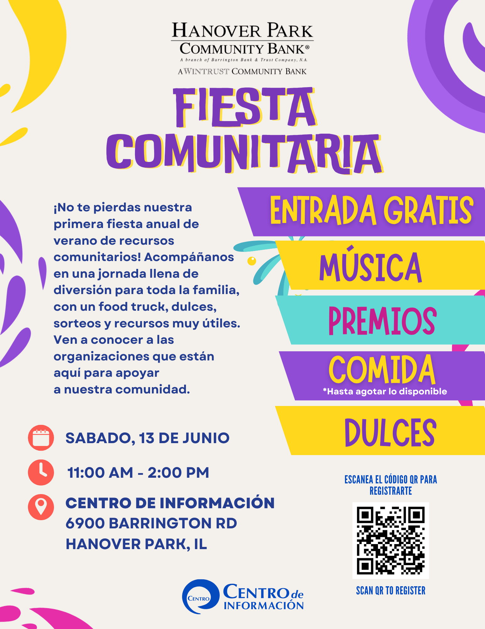 Fiesta Comunitaria Saturday, June 13, 2026 11:00 AM 2:00 PM Centro de Información 6900 Barrington Road Hanover Park, IL, 60133 United States (map) Google Calendar ICS Fiesta Comunitaria 2026 ¡TODOS ESTÁN INVITADOS a nuestra fiesta comunitaria en Hanover Park! ¡Anoten la fecha en sus calendarios e inviten a sus amigos, familiares, vecinos y compañeros de trabajo a unirse a nosotros en esta celebración anual!HAGA CLIC AQUI PARA REGISTRARSE
