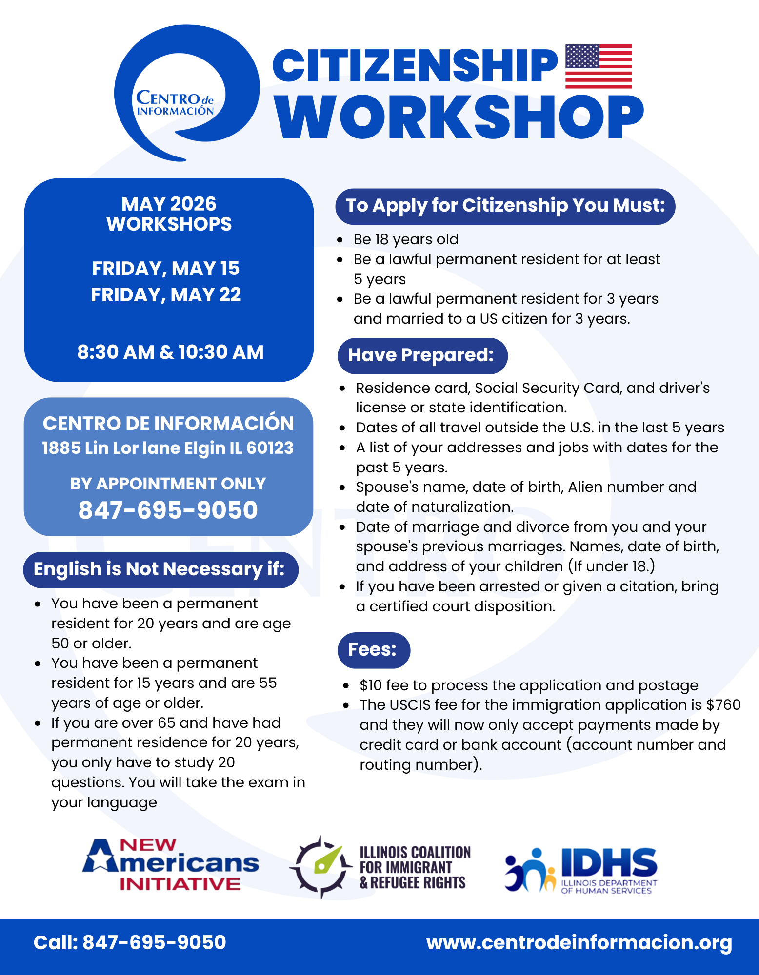 Centro de Información is hosting Citizenship Workshops to guide you through the naturalization process and help you prepare your application. Our team will assist you with eligibility requirements, necessary documents, and any questions you may have!